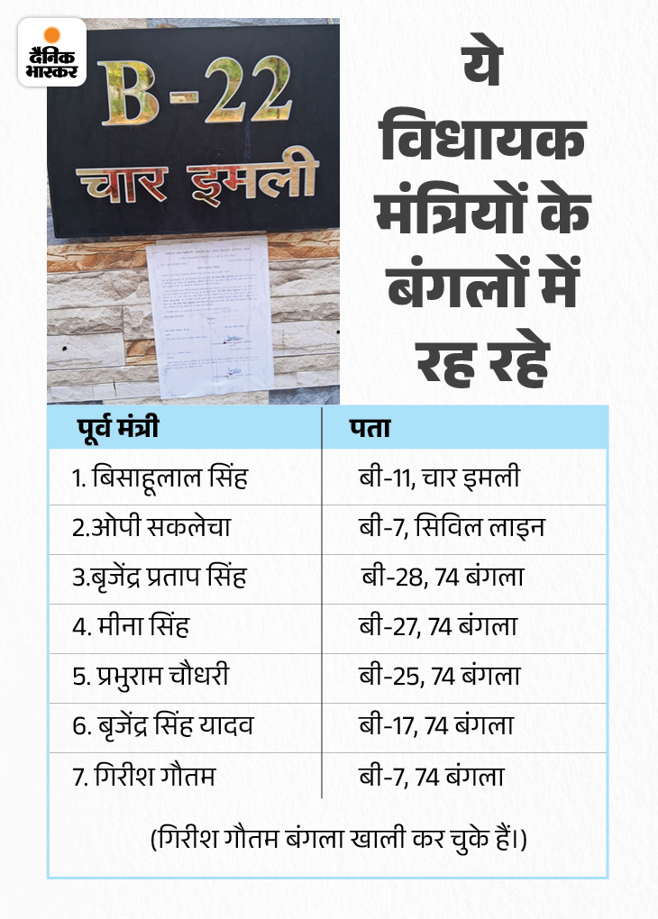 संबंधित अफसरों का कहना है कि बंगला खाली नहीं किया, तो 10 दिन का एक और नोटिस दिया जाएगा। इसके बाद ताला तोड़कर जबरन बंगला खाली कराया जाएगा। पूर्व मंत्रियों में कमल पटेल, उषा ठाकुर, मीना सिंह, दीपक जोशी, इमरती देवी, रामपाल सिंह, महेंद्र सिंह सिसोदिया समेत 28 नेताओं के नाम हैं।