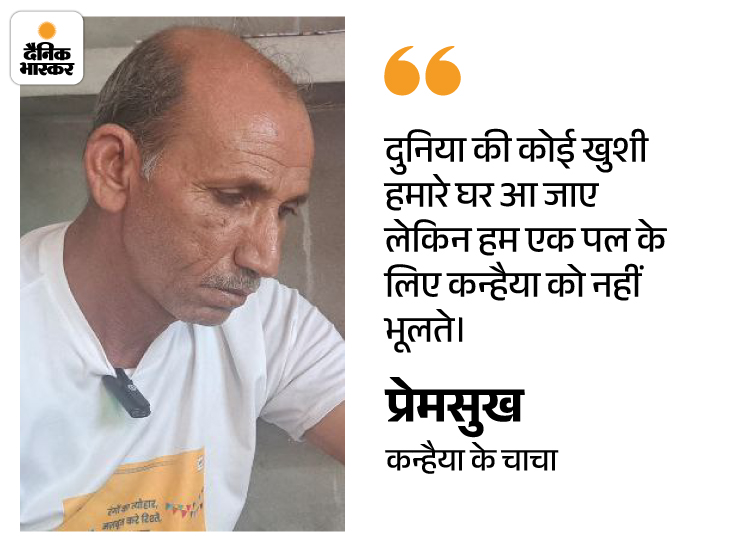बात करते करते प्रेमसुख भावुक हो जाते हैं। बेचैन होकर कहते हैं, ‘दुनिया की कोई खुशी हमारे घर आ जाए, लेकिन हम एक पल के लिए कन्हैया को नहीं भूलते। हम लोग उसके बारे में कोई बात ही नहीं करते। शुरू से लेकर आखिर तक वो क्लास में पहले नंबर पर आया। कोई खास शौक नहीं रहा उसे। न खेलने का न घूमने का। बस पढ़ाई, पढ़ाई।