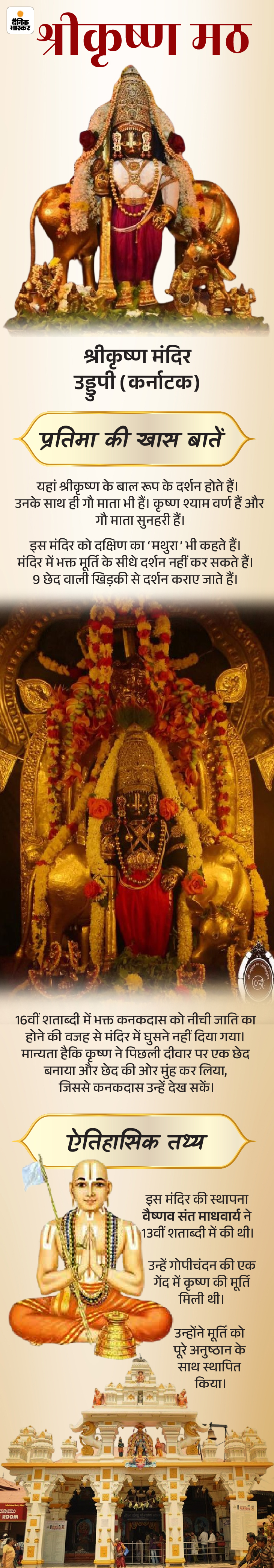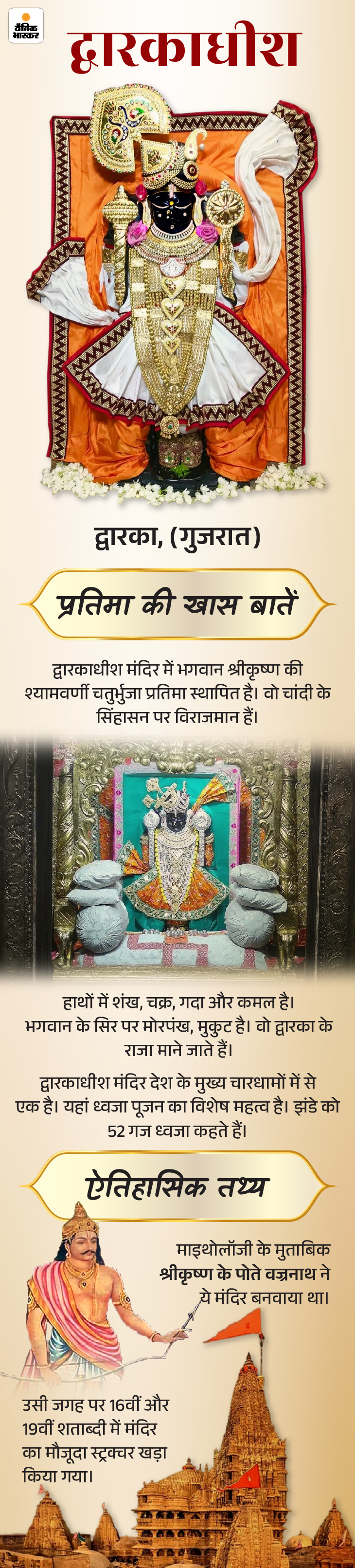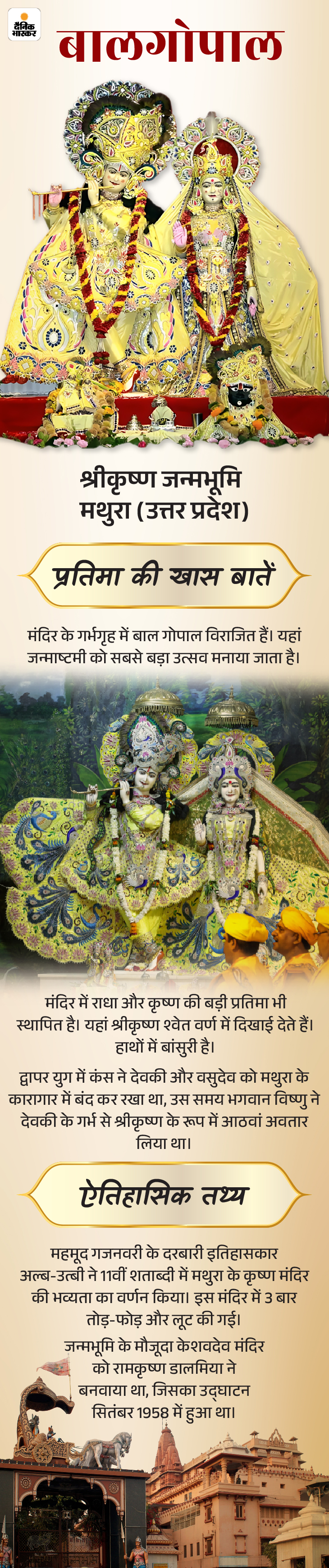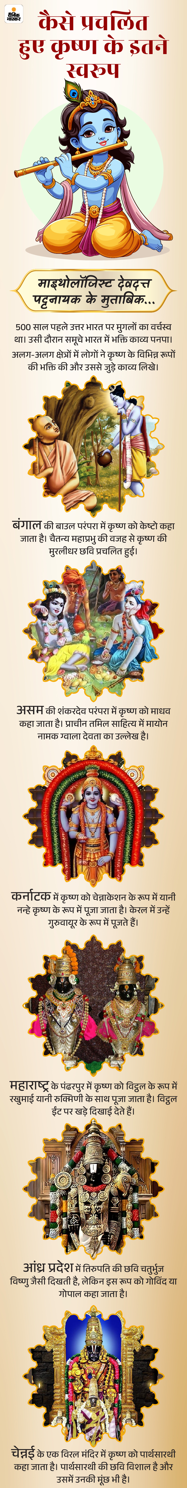 किसी मंदिर में कृष्ण की 1280 किलो सोने से बनी प्रतिमा है, कहीं लकड़ी से बनी बिना हाथ-पैर की अपूर्ण मूर्ति। कहीं पर भगवान बालरूप में हैं, तो कहीं मूंछ वाले कृष्ण भी। जन्माष्टमी पर खास मंडे मेगा स्टोरी में श्रीकृष्ण के मंदिरों में अलग-अलग तरह की 13 भंगिमाओं की रोचक कहानी…