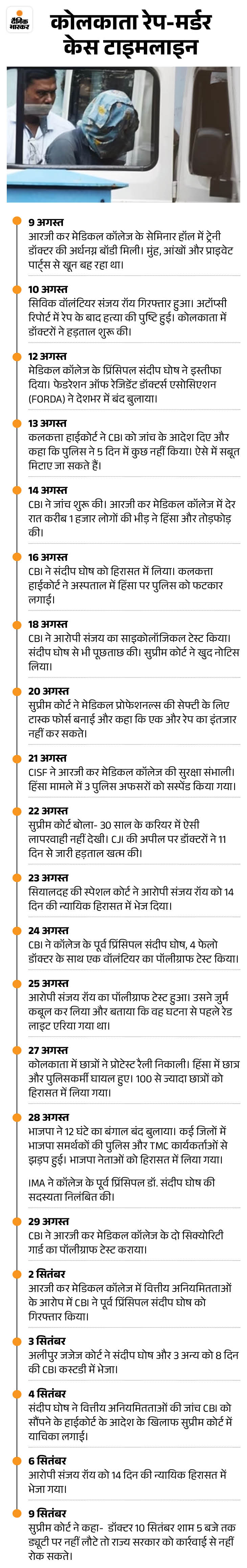 कोलकाता के आरजी कर मेडिकल कॉलेज और अस्पताल में 9 अगस्त को ट्रेनी डॉक्टर के साथ हुए रेप-मर्डर के विरोध में जूनियर डॉक्टर्स की हड़ताल मंगलवार को 31वें दिन भी जारी है।