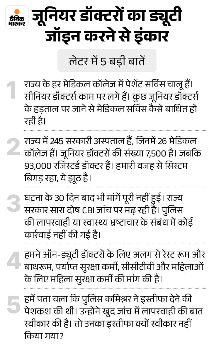 जूनियर डॉक्टर्स का कहना है कि उन्हें और पीड़ित को न्याय नहीं मिला है, इसलिए वे काम पर नहीं लौटेंगे। डॉक्टरों ने भी सरकार को शाम 5 बजे तक मांगें मानने का टाइम दिया है।