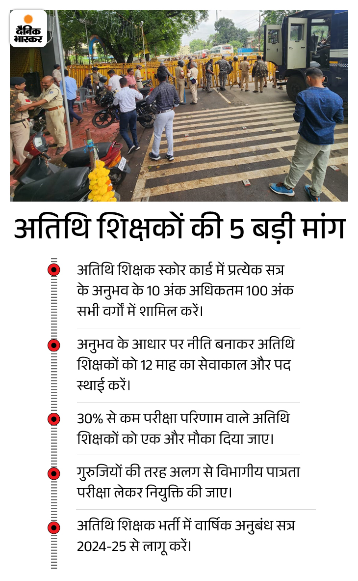 बतौर अतिथि शिक्षक परीक्षा के स्कोरकार्ड में प्रत्येक सत्र के लिए अधिकतम 10 अंक की पात्रता दी जाए। उन्होंने तिरंगा यात्रा निकालकर सीएम हाउस घेरने का ऐलान किया है। मौके पर भारी पुलिस बल तैनात है। वाटर कैनन भी मौजूद हैं।