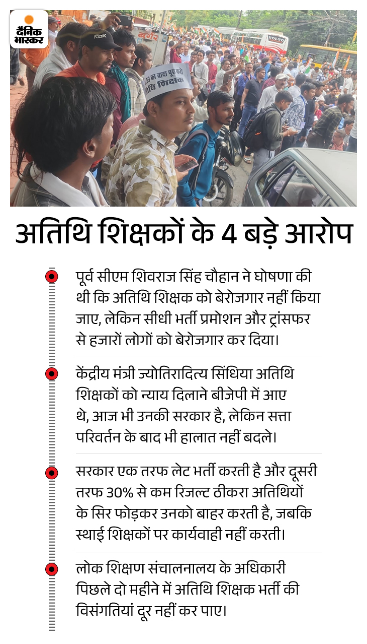 महासंघ के प्रदेश अध्यक्ष सुनील सिंह परिहार ने कहा- पूर्व मुख्यमंत्री शिवराज सिंह चौहान ने दो सितंबर 2023 को अतिथि शिक्षक पंचायत में अतिथि शिक्षकों को नियमित कर गुरुजी के समान वेतनमान देने की बात कही थी। यह वादा अब तक पूरा नहीं किया गया है। आज हम अपना भविष्य सुरक्षित करने के लिए राजधानी की सड़कों पर उतरे।