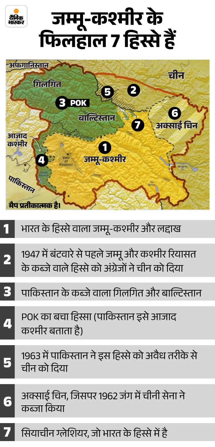 जम्मू-कश्मीर और लद्दाख पर भारत का कब्जा रहा, जबकि गिलगित-बाल्टिस्तान पर पाकिस्तान ने कब्जा बरकरार रखा, जिसे वो आजाद कश्मीर और भारत उसे PoK कहता है। कश्मीर के एक और हिस्से को बाद में पाकिस्तान ने चीन को सौंप दिया था, जिसे चीन अक्साई चिन कहता है।