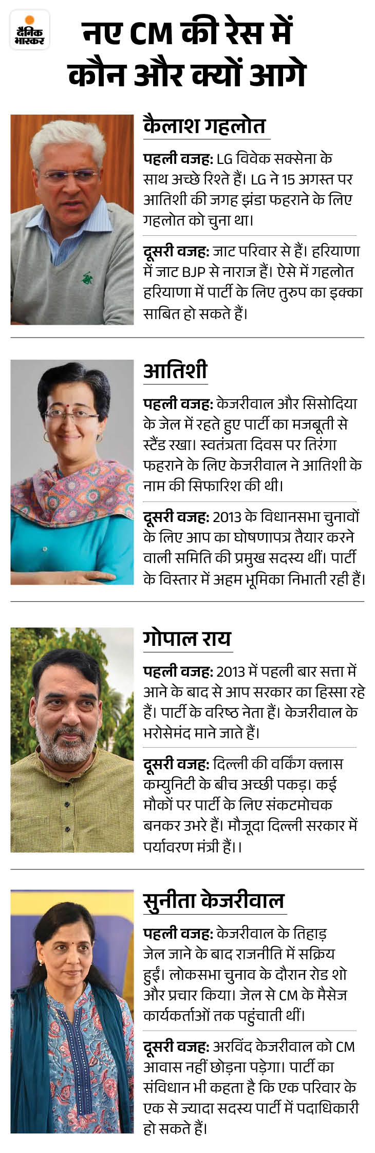 खास बात यह है कि आज ही PM मोदी का 74वां जन्मदिन है। सूत्रों के मुताबिक आतिशी, कैलाश गहलोत, गोपाल राय और सुनीता केजरीवाल में से कोई एक दिल्ली का अगला मुख्यमंत्री बन सकता है। हालांकि, सौरभ भारद्वाज ने विधायक दल की मीटिंग से पहले कहा- मुझे नहीं लगता कि सुनीता केजरीवाल नई CM होंगी। उनकी इसमें कोई दिलचस्पी नहीं है।