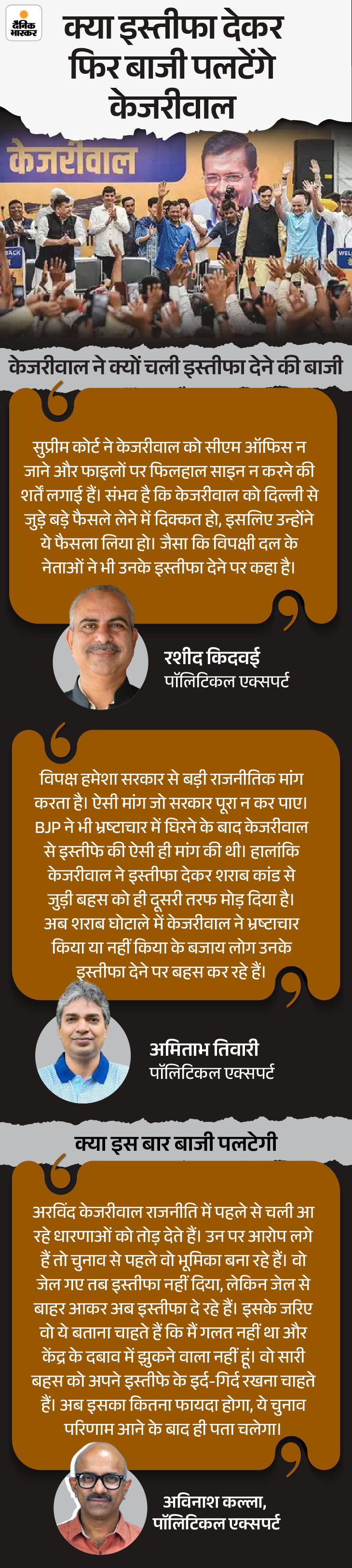 177 दिन जेल में रहकर बाहर आने के बाद 15 सितंबर को दिल्ली के CM अरविंद केजरीवाल ने ये बात कही थी। आज यानी 17 सितंबर की शाम 4 बजे वे अपना इस्तीफा दे सकते हैं। दिल्ली विधानसभा चुनाव से लगभग 5 महीने पहले केजरीवाल का इस्तीफा क्या दिल्ली की सियासी बाजी को पलट सकता है।
