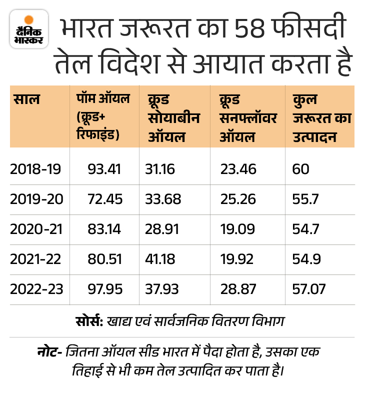भारत 2020-21 में 165 लाख टन फूड ऑयल इम्पोर्ट करने के साथ दुनिया का सबसे बड़ा इम्पोर्टर बन गया है। इस साल 80 हजार करोड़ रुपए का फूड ऑयल इम्पोर्ट किया गया। इसमें सबसे ज्यादा 59 प्रतिशत हिस्सा पाम ऑयल का है।