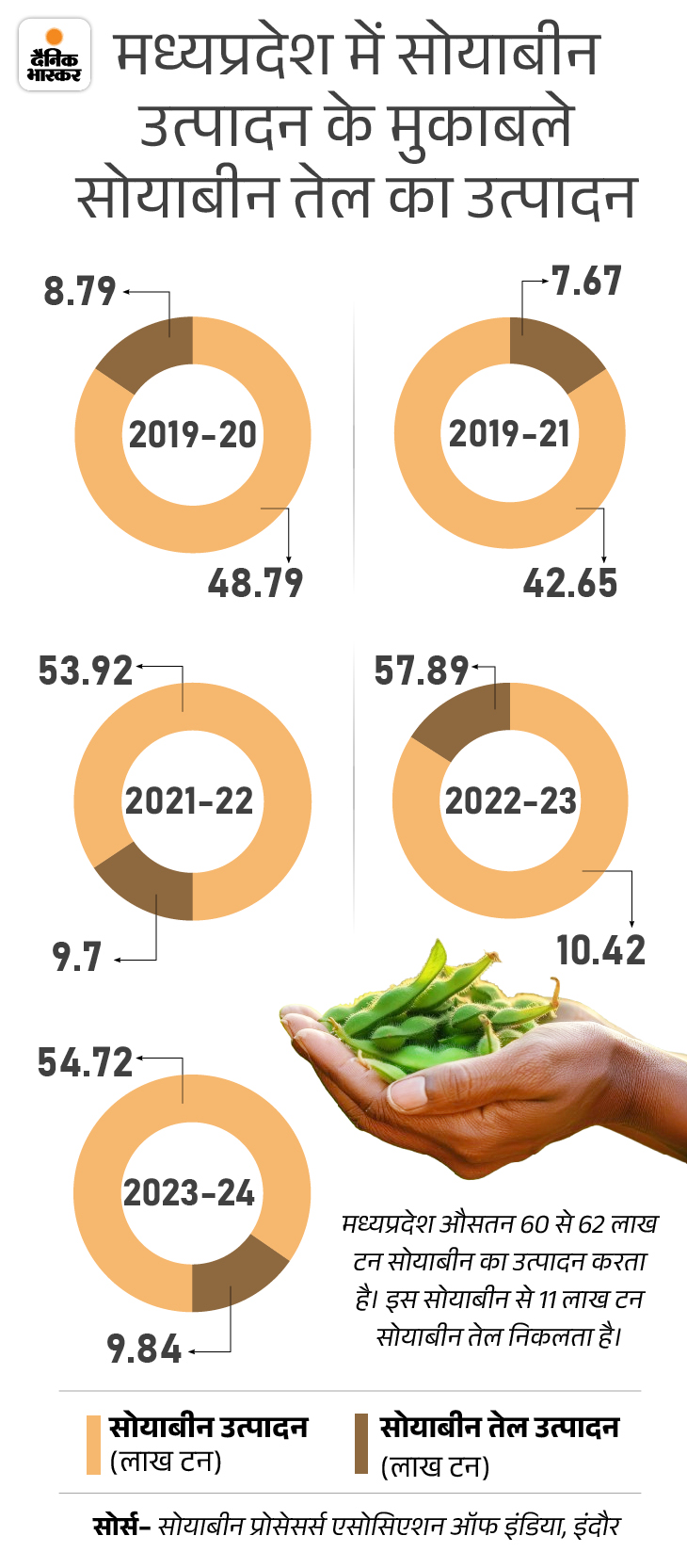 सोयाबीन एक्सपर्ट आलोक ठक्कर कहते हैं कि देश के कुल सोयाबीन का 42 फीसदी उत्पादन मध्यप्रदेश में होता है। साल 2023 में करीब 60 लाख हेक्टेयर क्षेत्र में सोयाबीन की बुआई हुई थी और 54 लाख टन उत्पादन हुआ। इस साल भी 62 लाख हेक्टेयर उत्पादन होने की उम्मीद है।