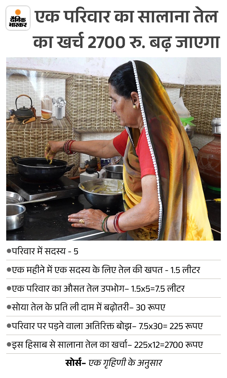दरअसल, तेल के दाम बढ़ने से एक परिवार के बजट पर हर साल 2000 से 2500 रुपए तक का भार आएगा। साथ ही रेस्टोरेंट-होटल में भी खाना महंगा मिलेगा। हालांकि, किसान नेता केदार सिरोही कहते हैं कि रोजमर्रा के खर्च में तेल का खर्च बहुत कम होता है। एक परिवार 5-7 एमएल में एक वक्त का खाना बना लेता है।