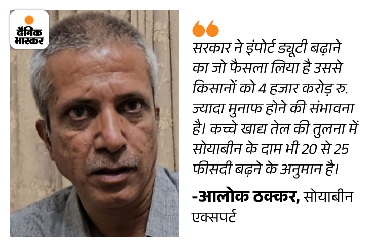 मंडी में सोयाबीन के सही दाम न मिलने से किसान परेशान थे। अब कच्चे सोयाबीन तेल पर आयात शुल्क बढ़ने से किसानों को मंडी में ज्यादा दाम मिलेंगे। वे कहते हैं कि फसल आने से पहले मंडी में सोयाबीन 3800 रु. प्रति क्विंटल के हिसाब से खरीदा जा रहा था। अब सरकार के फैसले के लिए इंदौर की ही मंडी का भाव देखें तो ये 4700 रु. प्रति क्विंटल हो चुका है। वहीं, सरकार ने भी सोयाबीन को एमएसपी 4892 रुपए प्रति क्विंटल पर खरीदने का फैसला लिया है।