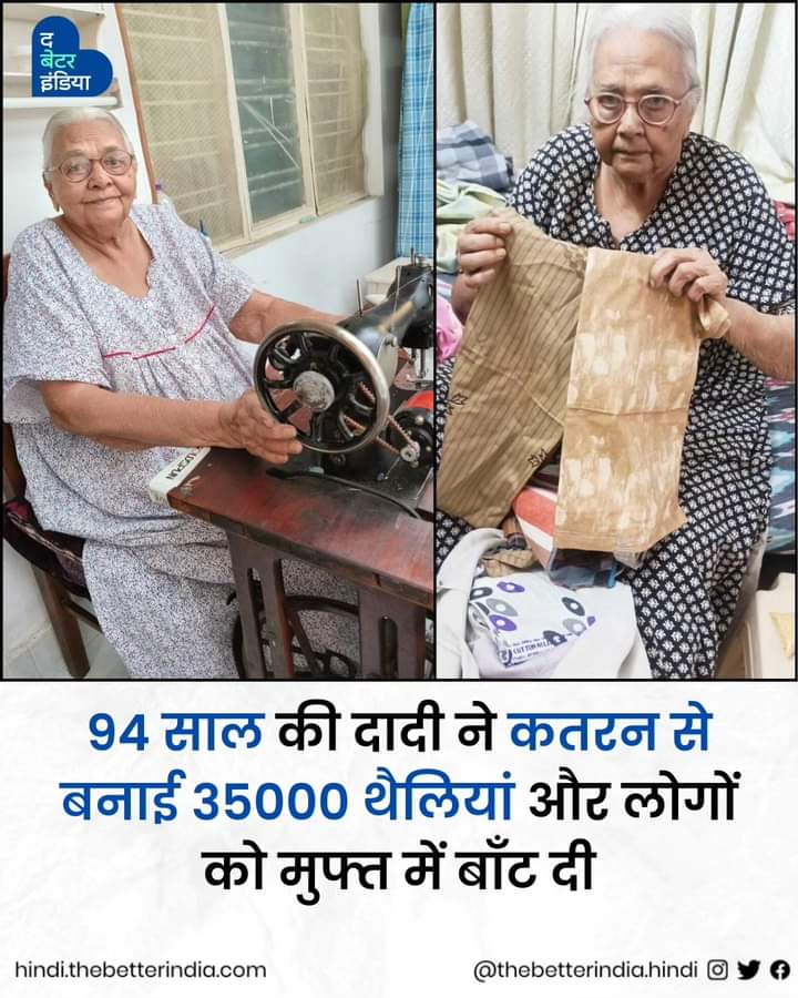 94 साल की मधुकान्ता भट्ट इस उम्र में भी रोज़ अखबार पढ़ती हैं, क्रिकेट मैच देखती हैं, पुराने गीत, भजन गाती हैं और सिलाई-बुनाई का काम भी करती हैं। उन्हें देखकर कोई अंदाजा भी नहीं लगा सकता कि थोड़े समय पहले वह गिर गईं थीं और तब से ठीक से चल भी नहीं पा रही हैं। बावजूद इसके वह अपनी हॉबी के ज़रिए पर्यावरण बचाने में मदद कर रही हैं। वह पिछले पांच सालों से प्लास्टिक मुक्त भारत अभियान में मदद कर रही हैं। उन्होंने बेकार कपड़ों की कतरन से 35000 थैलियां बनाईं हैं और लोगों को फ्री में बाँटी हैं।