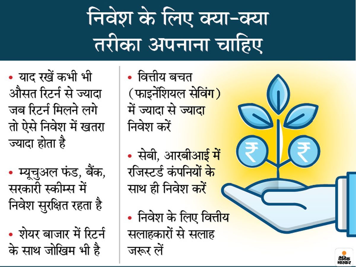 कभी भी पैसे को दोगुने या बहुत ज्यादा लाभ के लालच में निवेश मत कीजिए। पिछले 20-25 दिनों में बाजार के रेगुलेटर सेबी ने ऐसी 15 से ज्यादा निवेश की सलाह देनेवाली कंपनियों और व्यक्तियों पर प्रतिबंध लगा दिया है।