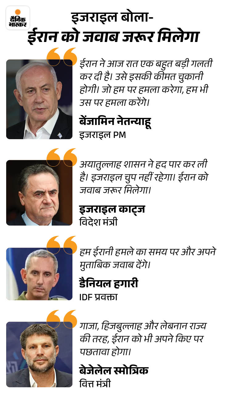 ईरान के हमले के बाद प्रधानमंत्री नेतन्याहू ने कहा कि ईरान को भारी कीमत चुकानी पड़ेगी। IDF ने कहा है कि हम ईरान को बख्शने वाले नहीं है। इन हमलों का जवाब जरूर दिया जाएगा। इसके लिए वक्त और जगह हम खुद चुनेंगे।
