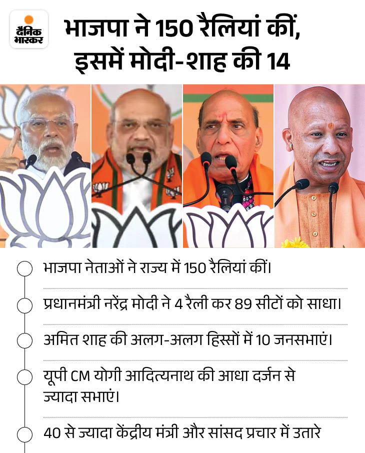 भाजपा: जीटी रोड-बागड़ बेल्ट में सुधार, बागी-भितरघात से निपटना चैलेंज भाजपा ने सत्ता विरोधी लहर के बीच अपने ऑर्गनाइज और ताबड़तोड़ प्रचार के दम पर बीते दो हफ्तों में ग्राउंड पर इम्प्रूव किया है। PM नरेंद्र मोदी ने 28 सितंबर को हिसार में रैली की थी। 21 सीट वाली जाट बाहुल्य बागड़ बेल्ट में हुई इस रैली और मोदी-शाह के आक्रामक रवैये से बदलाव दिखना शुरू हुआ। उम्मीदवारों के साथ-साथ वर्करों का मनोबल भी बढ़ा। नतीजा- आधा दर्जन से ज्यादा सीटों पर पार्टी ने दमखम दिखाया। मोदी 4 सभाओं के जरिए सभी सीटें कवर कर चुके हैं।