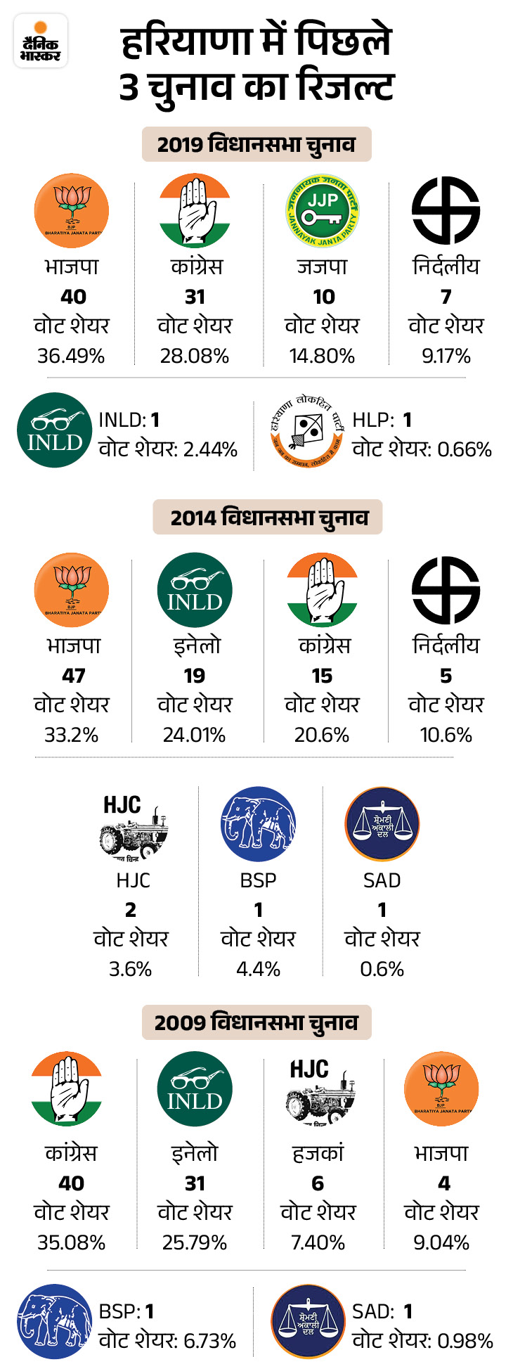 एक्सपर्ट बोले- नया इतिहास बनाने या परंपरा कायम रखने का चुनाव सीनियर जर्नलिस्ट कुमार मुकेश कहते हैं कि हरियाणा का मिजाज रहा है कि पार्टियों ने यहां लगातार 2 बार तो सरकार रिपीट की है, लेकिन लगातार 3 बार कोई सरकार नहीं बना पाया। एक फैक्ट यह भी है कि हरियाणा में उसी पार्टी की सरकार बनती है जो केंद्र में सत्तारूढ़ होता है। इसलिए समझ नहीं आ रहा कि इस बार हरियाणा नया इतिहास लिखेगा या अपनी परंपरा कायम रखेगा।