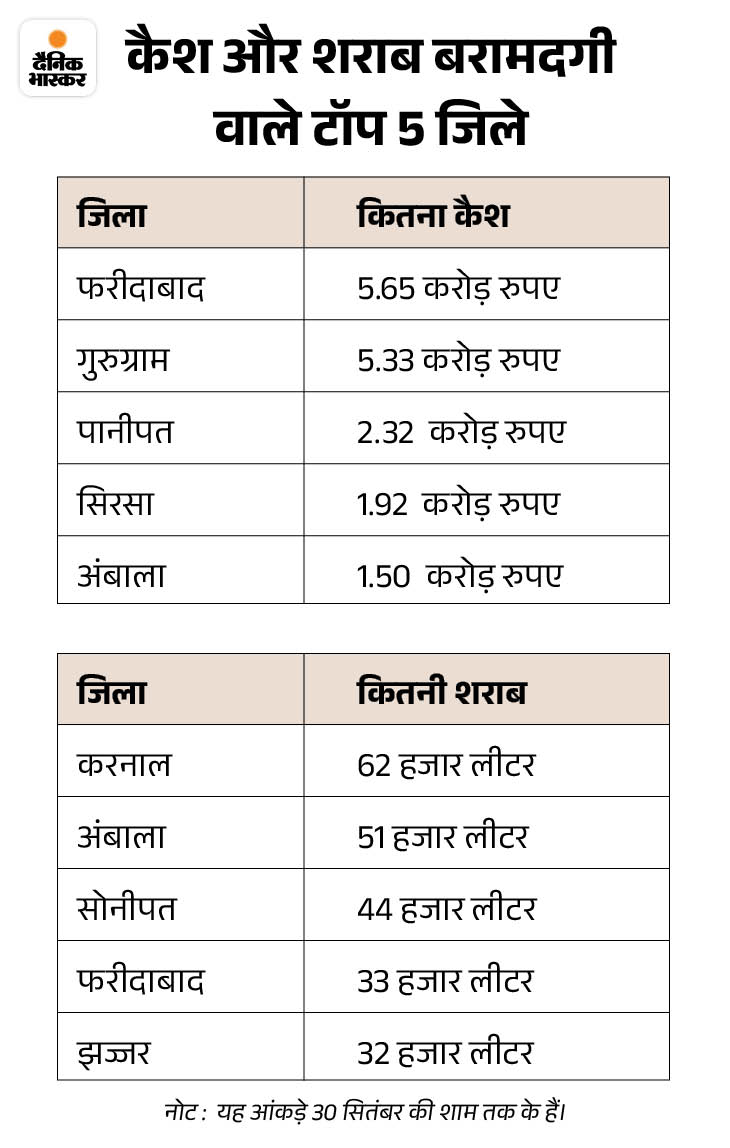 इन 46 दिनों में 15 करोड़ रुपए की 4.32 लाख लीटर शराब और साढ़े 9 करोड़ रुपए की ड्रग भी जब्त की गई। प्रदेश में 30 सितंबर की शाम तक कुल 65 करोड़ 88 लाख रुपए का कैश और सामान बरामद हो चुका था।