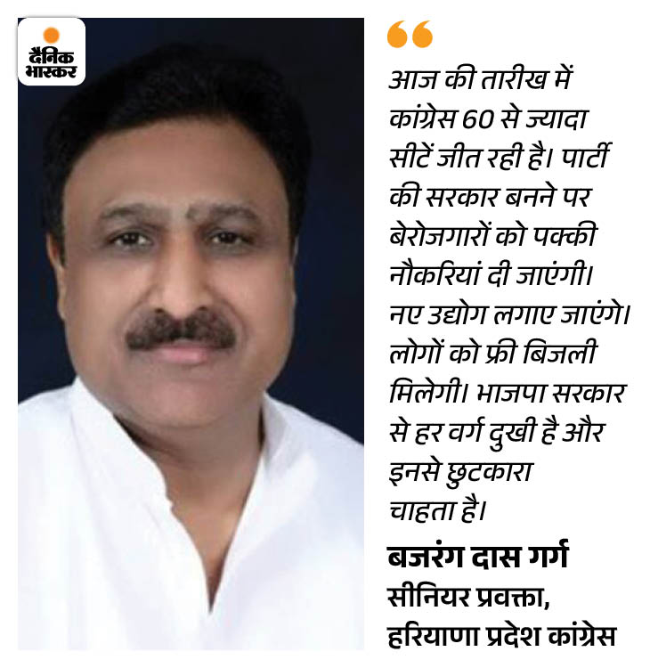 भाजपा ने हर वर्ग को दौड़ा-दौड़ाकर पीटा, लोग मुक्ति चाहते हैं : गर्ग हरियाणा प्रदेश कांग्रेस के सीनियर प्रवक्ता बजरंग दास गर्ग कहते हैं कि भाजपा सरकार के 10 साल के कार्यकाल में समाज का हर वर्ग परेशान रहा। अब जनता बदलाव चाहती है। चाहे किसान हो, सरकारी कर्मचारी हों, बेरोजगार युवा हों या छात्र, आंगनवाड़ी वर्कर हों या सरपंच, BJP सरकार ने सबको दौड़ा-दौड़ाकर पीटा। अब लोग इनसे मुक्ति चाहते हैं। जनता महंगाई और बढ़ते अपराध से दुखी है। हरियाणा नशे का अड्डा बनता जा रहा है।