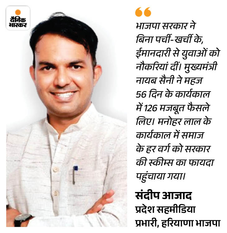 भाजपा ने 10 साल में चहुंमुखी विकास किया, इस बार भी हमारी सरकार : संदीप आजाद हरियाणा प्रदेश भाजपा के सहमीडिया प्रभारी संदीप आजाद का दावा है कि पार्टी हरियाणा में इस बार भी पूर्ण बहुमत की सरकार बनाने जा रही है। सड़कों की बात हो, मेडिकल कॉलेज-यूनिवर्सिटी या कॉलेज खोलने की बात हो या फिर वंदे भारत ट्रेन चलाने का काम हो, भाजपा 10 साल में प्रदेश का चहुंमुखी विकास किया है।