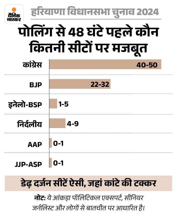 डेढ़ दर्जन सीटों पर कांटे की टक्कर मतदान से 48 घंटे पहले तक की बात करें तो तकरीबन डेढ़ दर्जन सीटें ऐसी हैं, जहां भाजपा-कांग्रेस के बीच मुकाबला बेहद कड़ा है। यहां आखिरी समय में पलड़ा किसी भी तरफ झुक सकता है। इन सीटों पर जीत-हार का मार्जिन भी कम रहने का अनुमान है। कई सीटों का रिजल्ट इस बात पर भी डिपेंड करेगा कि वहां थर्ड प्लेयर के रूप में इनेलो-BSP, AAP और JJP-ASP के अलावा निर्दलीय कितने वोट ले पाते हैं।