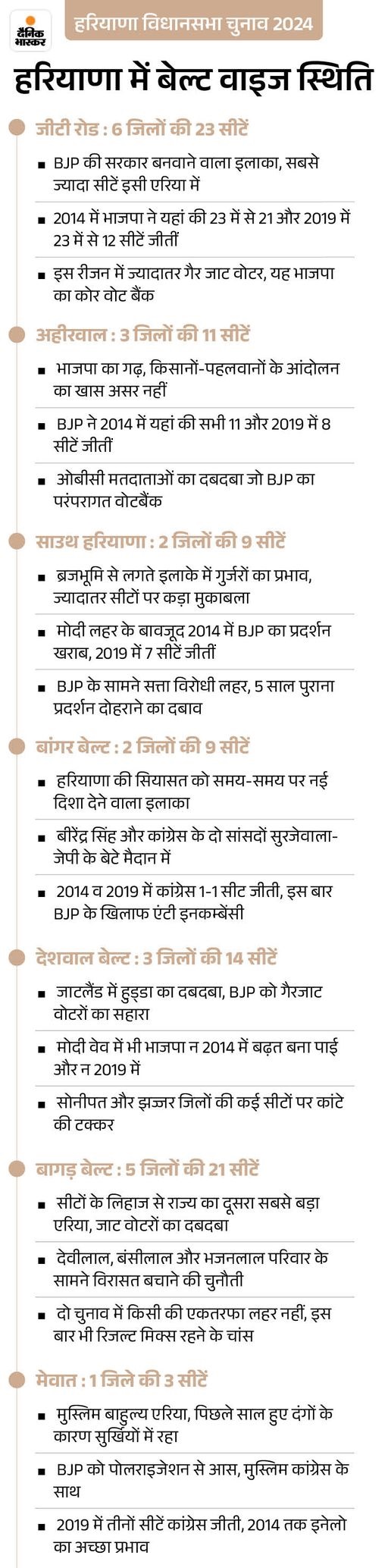 बागड़ के अलावा 23 सीटों वाली जीटी रोड बेल्ट BJP का गढ़ है। यहां भी कई सीटों पर उसके कैंडिडेट्स की स्थिति 2 हफ्ते पहले के मुकाबले सुधरी है। 2014 में पार्टी की 47 में से 21 और 2019 में 40 में से 12 सीटें जीटी रोड बेल्ट से ही आई थीं।