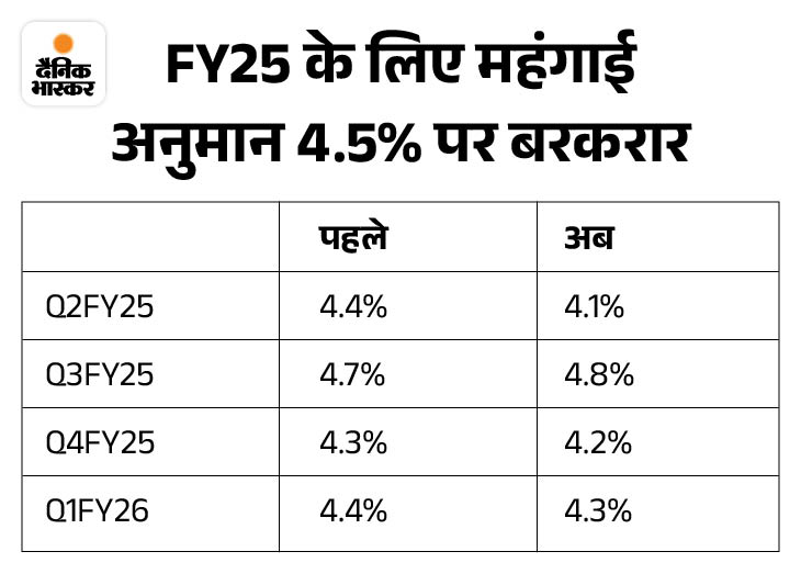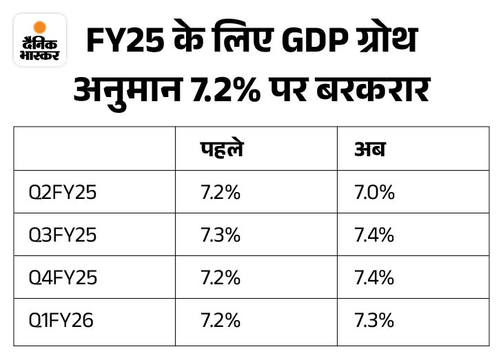 महंगाई को 4% पर लाने का लक्ष्य महंगाई को लेकर RBI गवर्नर शक्तिकांत दास ने कहा कि खुदरा महंगाई के लक्ष्य 4% पर बने हुए हैं। हालांकि, सितंबर महीने में महंगाई के आंकड़े बढ़े हुए लग सकते हैं। मौजूदा मैक्रो-इकोनॉमिक मापदंड संतुलित हैं। GDP ग्रोथ को लेकर उन्होंने कहा कि कारोबारी साल 2025 के दौरान यह 7.2% रह सकती है।