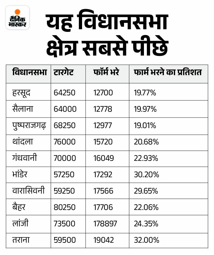 मंत्री शाह की सीट हरसूद में 64250 सदस्य बनाने का टारगेट तय किया गया था। फर्स्ट फेज में मात्र 12700 यानी 19.77% फॉर्म भर पाए। 10 विधानसभा सीटें ऐसी हैं जहां सदस्यता का आंकड़ा 20 से 32 प्रतिशत ही सदस्यता हो पाई है।