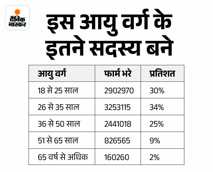 25 सितंबर को बने 9.33 लाख सदस्य 2 सितंबर को सदस्यता अभियान की शुरुआत हुई। पहले दिन 2,47,491 सदस्य बने। अगले दिन 3 सितंबर को 7,52,110 मेंबर बने। इसके बाद सदस्यता का आंकड़ा पौने दो लाख से लेकर सवा तीन लाख मेंबर डेली रहा। 16 सितंबर को आंकडे़ में इजाफा हुआ और एक दिन में 6,75,790 सदस्य बने। 25 सितंबर को 9 लाख 33 हजार सदस्य बने।