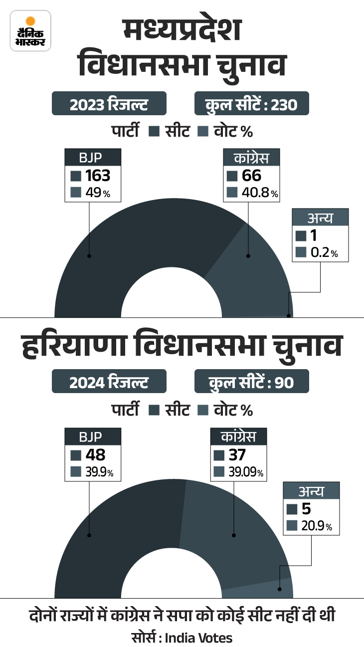 सपा हरियाणा विधानसभा चुनाव में सीटें न दिए जाने से भी नाराज है। मध्य प्रदेश विधानसभा चुनाव में भी कांग्रेस लीडर कमलनाथ ने सपा को सीट देने से इनकार कर दिया था। दोनों राज्यों में कांग्रेस को हार झेलनी पड़ी। यही कारण था कि हरियाणा का रिजल्ट आते-आते सपा ने अपने उम्मीदवारों का ऐलान कर दिया। इसे MP और हरियाणा का बदला माना जा रहा है।