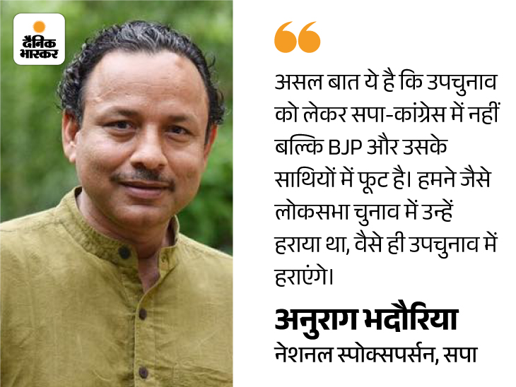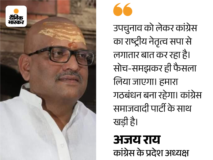 कांग्रेस: हमारे कार्यकर्ता नाराज नहीं, गठबंधन बना रहेगा कांग्रेस के UP चीफ अजय राय कहते हैं, ’उपचुनाव में टिकट बंटवारा कोई मुद्दा नहीं है। सपा की लिस्ट आने के बाद कांग्रेस कार्यकर्ता नाराज नहीं हैं, क्योंकि दोनों पार्टियों का लक्ष्य है BJP के जंगलराज को खत्म करना। हम लोग मिलकर चुनाव लड़ेंगे।’