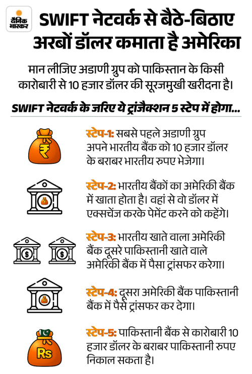 सवाल-2: डॉलर की पावर के दम पर अमेरिका बैठे-बिठाए कैसे अरबों कमाता है? जवाब: हम किसी चीज को खरीदने के लिए कई तरीकों से उसका दाम चुकाते हैं। जैसे- कैश, ऑनलाइन बैंकिंग, UPI ट्रांसफर। ऐसे ही दुनियाभर के देश आपस में व्यापार करने के लिए अमेरिका के SWIFT नेटवर्क का इस्तेमाल करते हैं। इसके जरिए अमेरिका बैठे-बिठाए अरबों कमाता है।