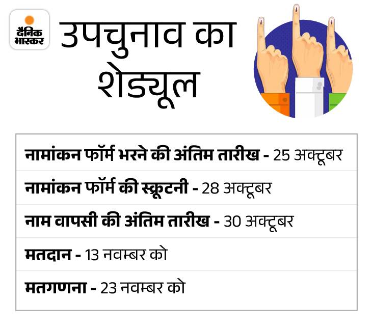बुधनी और विजयपुर विधानसभा सीटों पर 25 अक्टूबर को नामांकन का आखिरी दिन है। इससे पहले गुरुवार को विजयपुर में भाजपा प्रत्याशी रामनिवास रावत और बुधनी से कांग्रेस प्रत्याशी राजकुमार पटेल नामांकन दाखिल करेंगे।