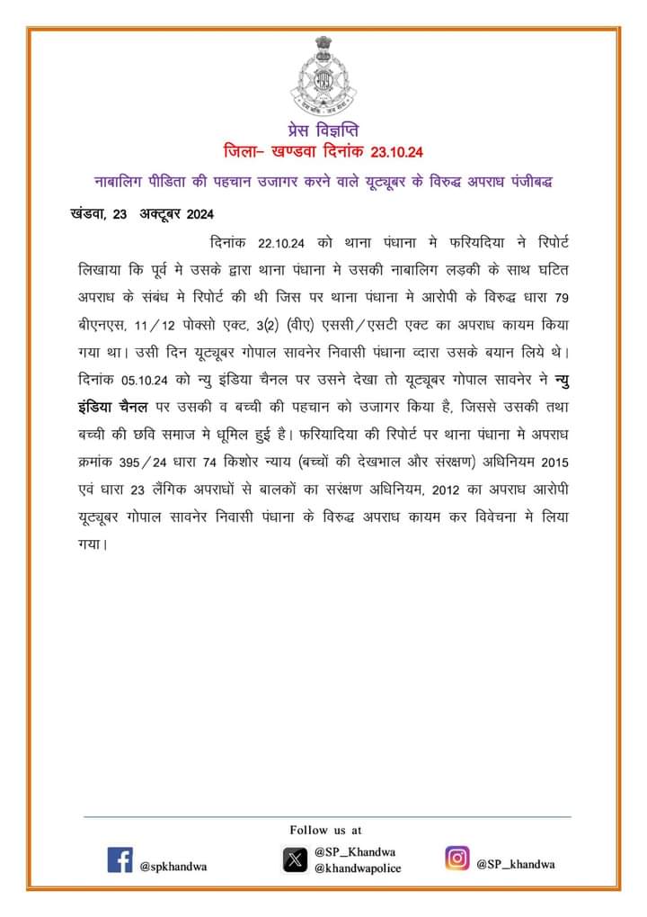 राज्य नाबालिग पीडिता की पहचान उजागर करने वाले यूट्यूबर के विरूद्ध अपराध पंजीबद्ध………….. admin October 24, 2024 0 Spread the love Post navigation Previous: भाजपा प्रदेश अध्यक्ष श्री विष्णुदत्त शर्मा, प्रदेश संगठन महामंत्री श्री हितानंद जी एवं प्रदेश चुनाव अधिकारी श्री विवेक नारायण शेजवलकर ने संगठन चुनाव कार्यालय का किया शुभारंभNext: 5 लाख रुपये रिश्वत लेते उपयंत्री गिरफ्तार… More Stories राज्य साधना सप्ताह में मप्र को अधिकतम पाठयक्रम पूरा करने राष्ट्रीय स्तर पर तीसरा स्थान admin April 18, 2026 0 राज्य मुख्यमंत्री डॉ. यादव ने गुरू अंगद देव जी के प्रकाश पर्व की शुभकामनाएं दीं admin April 18, 2026 0 राज्य 10वीं-12वीं बोर्ड के विद्यार्थियों को द्वितीय अवसर परीक्षा का मिलेगा मौका : मुख्यमंत्री डॉ. यादव admin April 18, 2026 0 Leave a Reply Cancel replyYour email address will not be published. Required fields are marked *Comment * Name * Email * Website Save my name, email, and website in this browser for the next time I comment. Δ