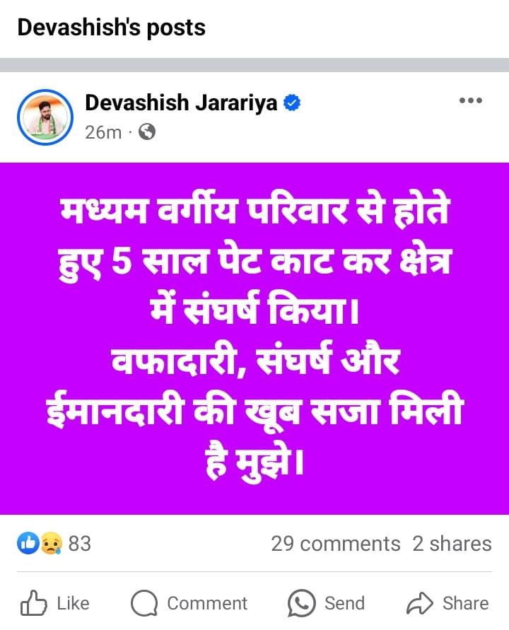 भिंड सीट से पिछले लोकसभा चुनाव में कांग्रेस प्रत्याशी रहे देवाशीष जरारिया का दर्द इस बार टिकट कटने की आशंका पर छलक उठा। उन्होंने सोशल मीडिया पर लिखा- ‘मध्यम वर्गीय परिवार से होते हुए 5 साल पेट काट कर क्षेत्र में संघर्ष किया। वफादारी, संघर्ष और ईमानदारी की खूब सजा मिली है मुझे।’