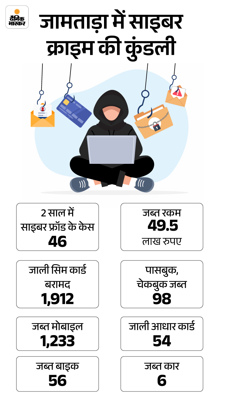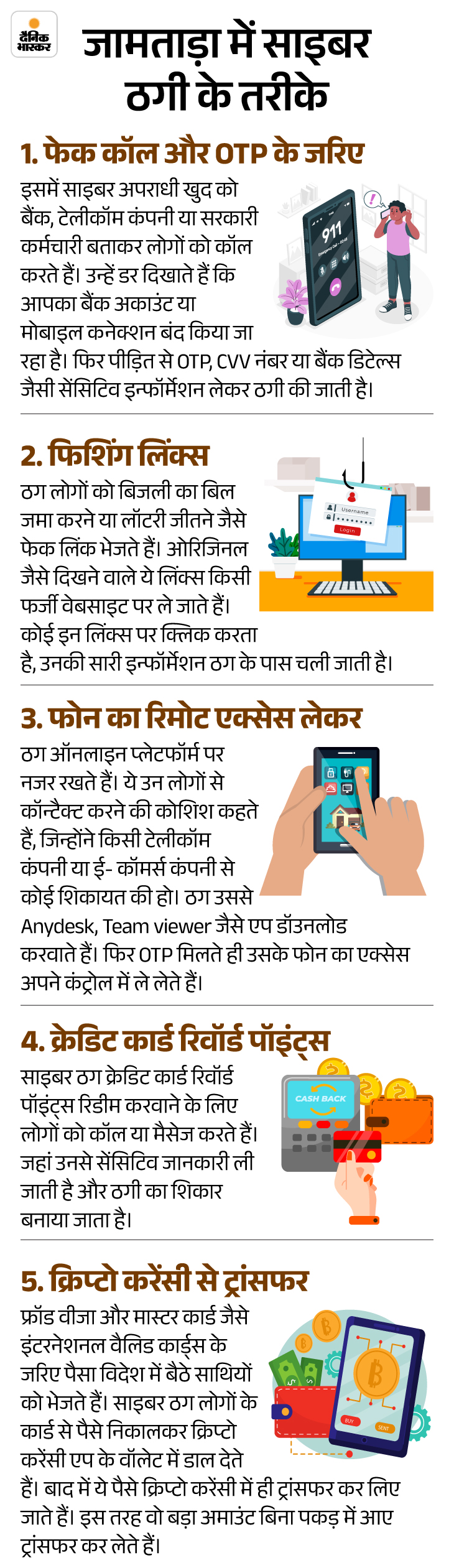 नारायणपुर में जुलाई 2024 में साइबर ठग प्रदीप कुमार मंडल की गैंग के पिंटू, मुकेश, गणपति, प्रकाश और विशु मंडल को चार्जशीट पर सुनवाई के बाद जेल भेज दिया गया था। इस गैंग ने नकली बैंक मैनेजर बनकर लोगों से 65.99 लाख रुपए की ठगी की थी। इसी गैंग पर नेटफ्लिक्स ने ‘जामताड़ा’ वेबसीरीज बनाई थी।