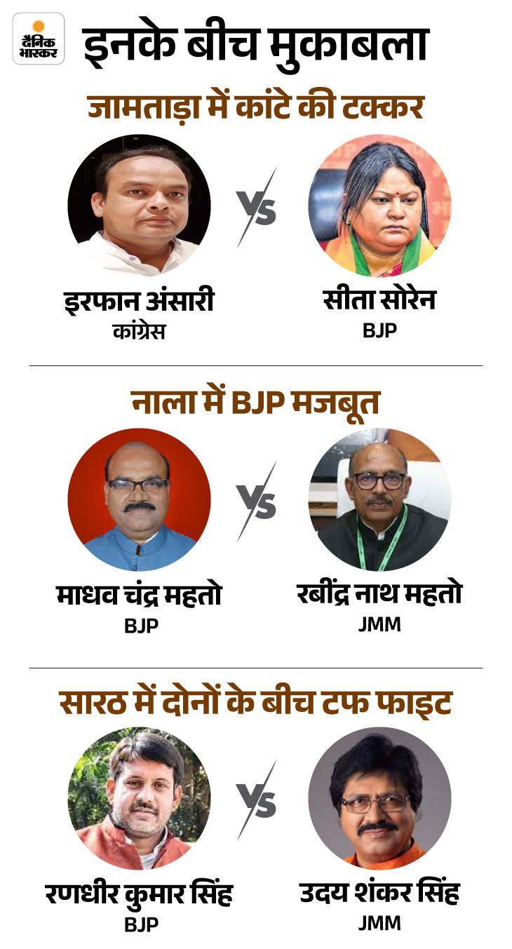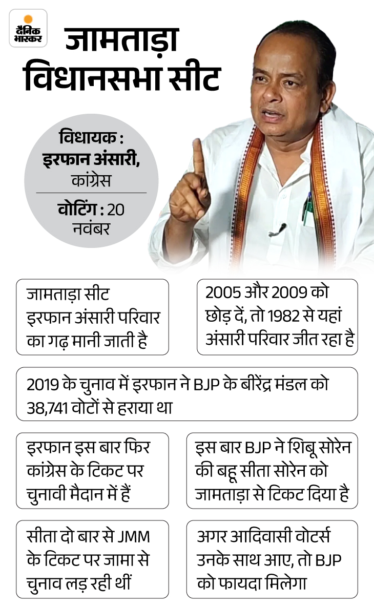 साइबर क्राइम का गढ़ कहे जाने वाले जामताड़ा में 20 नवंबर को वोटिंग होनी है। BJP ने यहां शिबू सोरेन की बड़ी बहू सीता सोरेन को उतारा है। उनका मुकाबला कांग्रेस के मौजूदा MLA इरफान अंसारी से है। BJP यहां घुसपैठ का मुद्दा उठा रही है। लोगों की शिकायत है कि जिस साइबर फ्रॉड की वजह से जामताड़ा बदनाम है, वो मुद्दा क्यों नहीं है।