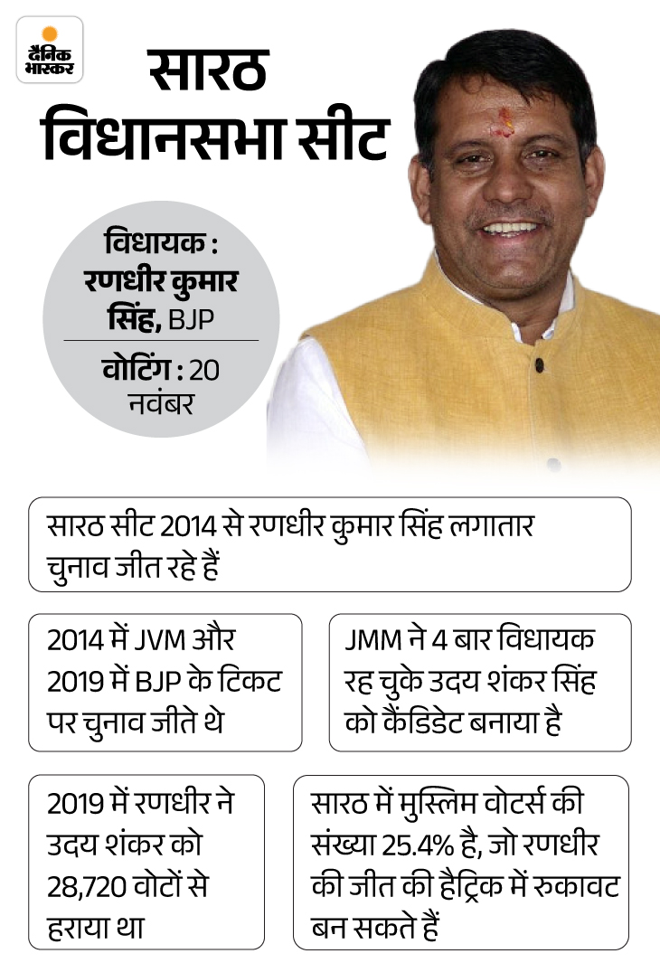 सारठ विधानसभा सीट पर JMM और BJP के बीच टफ फाइट है। इस सीट का इतिहास रहा है कि यहां 1980 के बाद से किसी भी पार्टी का दबदबा नहीं रहा है। हर चुनाव में अलग-अलग पार्टियां जीतती आई हैं।