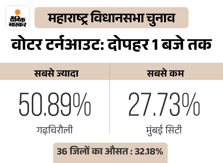 राज्य में दोपहर 1 बजे तक 32.18% वोट पड़े। गढ़चिरौली में सबसे ज्यादा 50.89% और मुंबईसिटी सिटी में सबसे कम 27.73% वोट डाले गए।