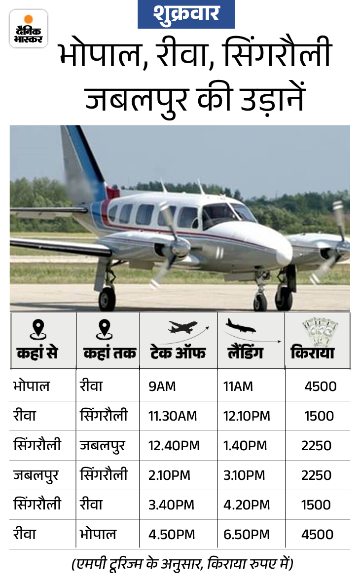 नए शेड्यूल के मुताबिक, भोपाल से जबलपुर, रीवा, सिंगरौली और खजुराहो के लिए सप्ताह में 3-3 दिन अलग-अलग टाइमिंग पर फ्लाइट हैं। मामले में एमपी टूरिज्म बोर्ड के कंपनी सेक्रेटरी अंकित कौरव ने कहा-