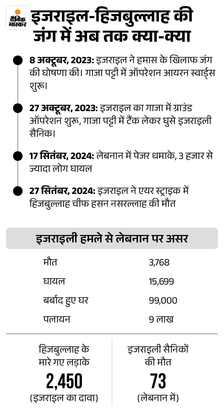इजराइल ने लेबनान में ग्राउंड ऑपरेशन शुरू करने से पहले ही उसकी टॉप लीडरशिप का खात्मा कर दिया था। इसमें सबसे बड़ा नाम हिजबुल्लाह चीफ हसन नसरल्लाह का था। इजराइल ने 27 सितंबर को लेबनान के बेरूत में 80 टन बम से हमला किया था।