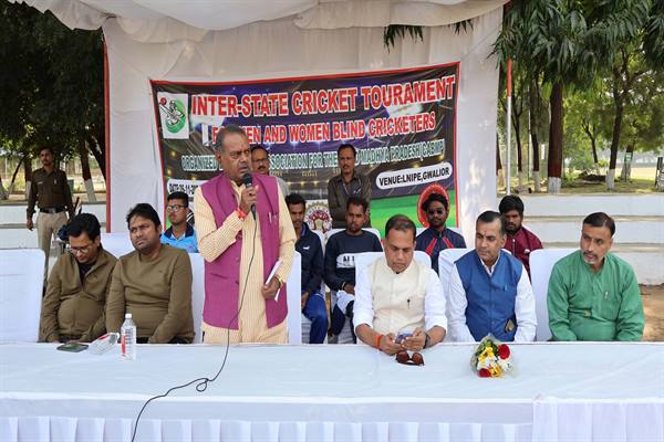 सामाजिक न्याय, दिव्यांगजन सशक्तिकरण एवं उद्यानिकी मंत्री श्री नारायण सिंह कुशवाह ने मंगलवार को ग्वालियर में इंटर स्टेट वुमन ब्लाइंड क्रिकेट टूर्नामेंट का उदघाटन किया। मंत्री श्री कुशवाह ने कहा मुख्यमंत्री डॉ. मोहन यादव के नेतृत्व में प्रदेश सरकार दिव्यांग प्रतिभाओं को आगे बढ़ाने के लिए संकल्पबद्ध होकर काम कर रही है। सरकार द्वारा दिव्यांग खिलाड़ियों को हर संभव खेल सुविधाएँ उपलब्ध कराई जा रहीं हैं। मंत्री श्री कुशवाह ने टूर्नामेंट में भाग ले रहीं क्रिकेट टीम के सदस्यों से परिचय प्राप्त कर उन्हें प्रोत्साहित किया।