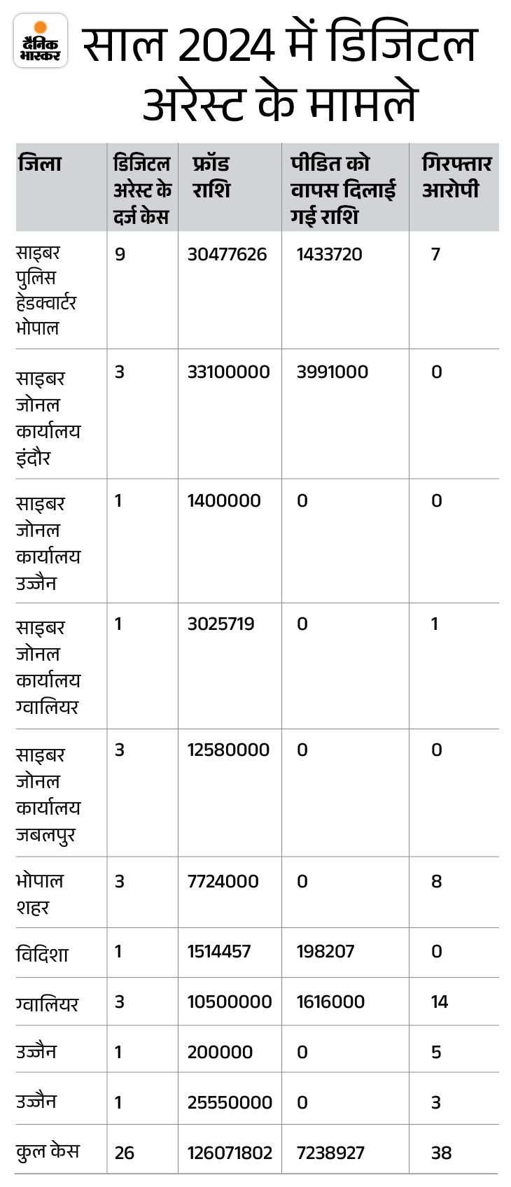 साल 2024 में डिजिटल अरेस्ट के 26 मामले दर्ज किए गए, जिनमें ठगों ने 12 करोड़ 60 लाख 71 हजार 802 रुपए की ठगी की। पुलिस ने 38 आरोपियों को गिरफ्तार कर 72 लाख 38 हजार 927 रुपए की राशि पीड़ितों को वापस कराई है।