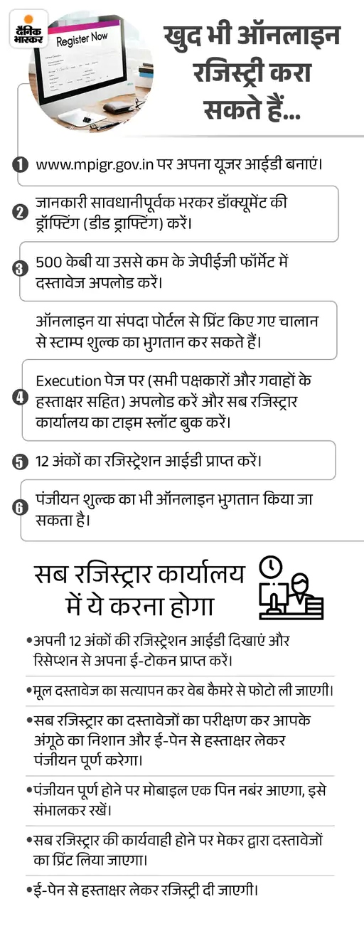 - तत्काल स्लॉट से: इसके लिए आईजी पंजीयन कार्यालय में एक सेंटर बनाया जा रहा है। इसमें तत्काल रजिस्ट्री के लिए अलग टीम रहेगी। शुरुआत में 5 सब-रजिस्ट्रार तैनात रहेंगे। बाद में इनकी संख्या बढ़ाई जा सकती है। जो व्यक्ति तत्काल स्लॉट बुक करेगा, वह ऑनलाइन वीडियो के जरिए जुड़ जाएगा।