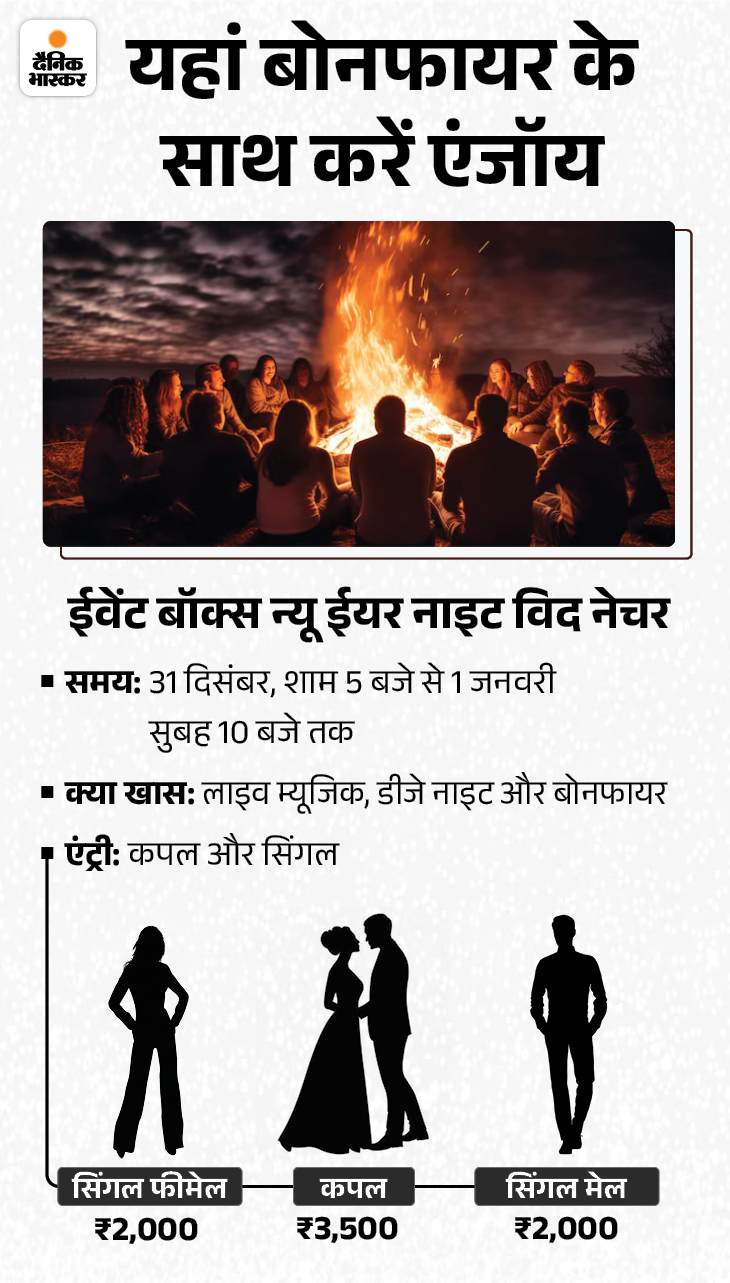 शहर के कुछ खास होटल्स और रिसॉर्ट्स में अलग-अलग थीम पर पार्टियां होंगी। इसके अलावा, नेचर के बीच बोनफायर और म्यूजिक लाइट का भी आनंद ले सकते हैं।