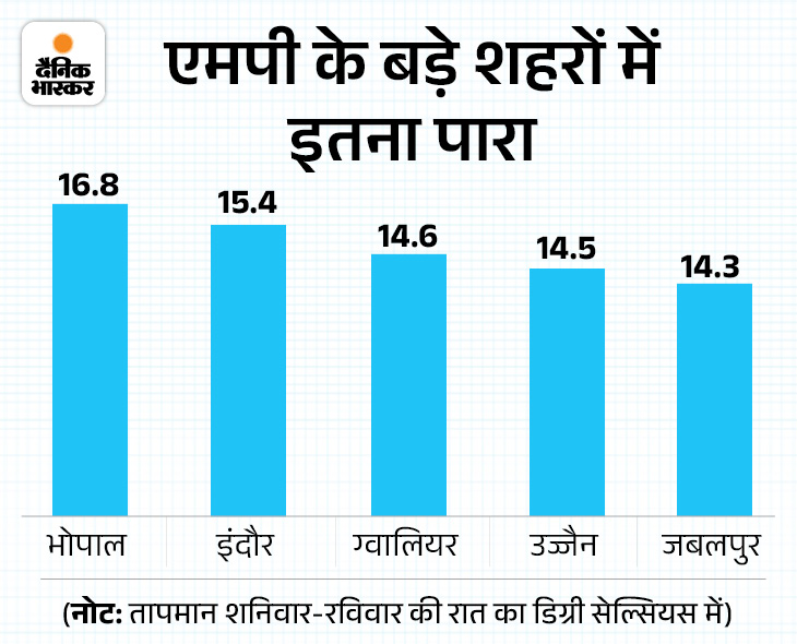 शनिवार-रविवार रात के तापमान में भी गिरावट शनिवार-रविवार की रात में भी कई शहरों में तापमान में गिरावट देखने को मिली। सबसे ठंडा नीमच का मरुखेड़ा रहा। यहां पारा 8.6 डिग्री दर्ज किया गया। नरसिंहपुर, नौगांव, पचमढ़ी में पारा 12 डिग्री से नीचे रहा। राजगढ़, मंडला, टीकमगढ़, रतलाम, उमरिया, खंडवा और गुना में भी पारा 15 डिग्री से कम ही दर्ज किया गया। बड़े शहरों में भोपाल में 16.8 डिग्री, इंदौर में 15.4 डिग्री, ग्वालियर में 14.6 डिग्री, उज्जैन में 14.5 डिग्री और जबलपुर में 14.3 डिग्री सेल्सियस दर्ज किया गया।