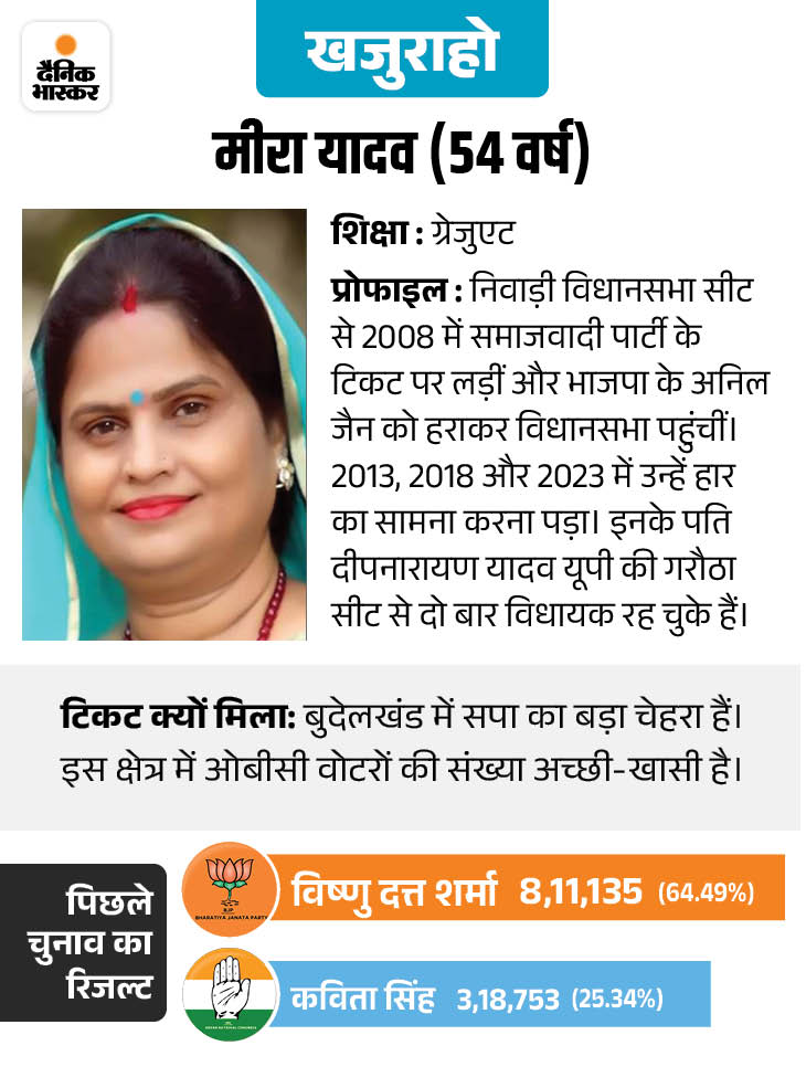 खजुराहो से सपा ने बदला टिकट, अब मीरा यादव प्रत्याशी:मनोज यादव का दो बार कट चुका टिकट; पार्टी का प्रदेश अध्यक्ष बनाया