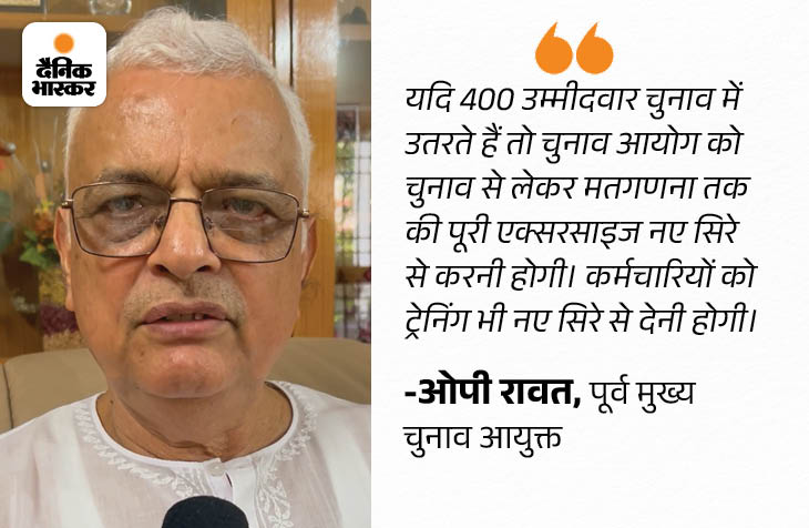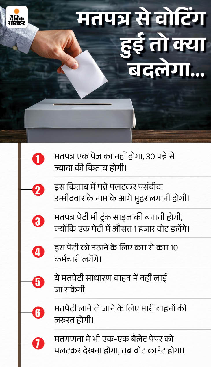 रावत कहते हैं कि चुनाव आयोग के पास फिर यही विकल्प है कि मतपत्र से वोटिंग कराए, लेकिन ये भी इतना आसान नहीं होगा। जब 400 उम्मीदवार होंगे तो बैलेट पेपर भी 30 से 40 पेज का बनेगा। इसके लिए मतपेटी भी नए सिरे से डिजाइन करनी होगी। जिसमें 30 से 40 पेज का एक बैलेट पेपर जा सके। उसी हिसाब से पोलिंग बूथ पर कर्मचारियों की ड्यूटी लगानी पड़ेगी। मतगणना में भी तीन गुना कर्मचारियों की जरूरत पड़ेगी।