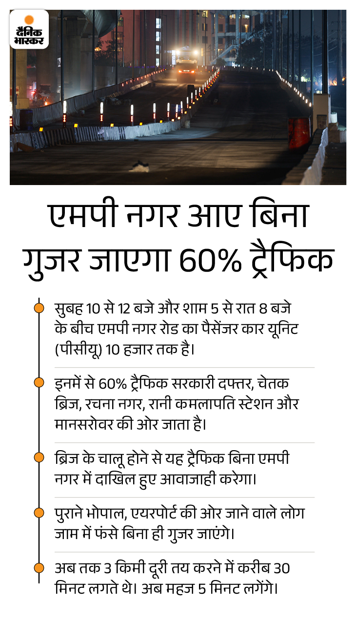 इस ब्रिज से एमपी नगर का 60 प्रतिशत ट्रैफिक यानी 6 हजार गाड़ियां हर दिन गुजरेंगी। करीब पौने 3 किमी दूरी तय करने में अब 5 मिनट का समय लगेगा। पहले सड़क मार्ग पर दो ट्रैफिक सिग्नल और चौराहों पर जाम की वजह से ये दूरी तय करने में 30 मिनट से अधिक लग जाते थे।