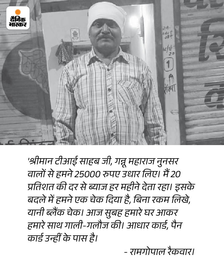 डेढ़ साल पहले रामगोपाल रैकवार ने पास के गांव नुनसर के गन्नू महाराज से 25 हजार रुपए 20 फीसदी ब्याज पर लिए थे। हर महीने वह गन्नू को 5 हजार रुपए ब्याज के चुकाता रहा। 2 माह से ब्याज नहीं देने पर गन्नू ने रामगोपाल को घर पर आकर धमकाया था। डेढ़ साल के अंदर रामगोपाल 5 हजार रुपए महीने के हिसाब से 90 हजार ब्याज दे चुका था। इसके बाद भी नकद 25 हजार और 2 माह का 10 हजार रुपए ब्याज मांग रहा था।