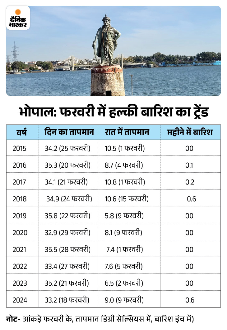 भोपाल में रातें ठंडी रहती है, दिन गर्म राजधानी भोपाल में रातें ठंडी रहती हैं, जबकि दिन गर्म। वर्ष 2015 से 2024 के बीच 4 साल दिन का अधिकतम तापमान 35 डिग्री के पार पहुंच गया। रात में 7 साल पारा 10 डिग्री से कम दर्ज किया गया। इस महीने बारिश होने का भी ट्रेंड है। हालांकि, 10 साल में सिर्फ 3 बार ही पानी गिरा है। रिकॉर्ड की बात करें तो 11 फरवरी 1950 को रात का पारा 1.7 डिग्री रहा था, जो ओवरऑल रिकॉर्ड है। 22 फरवरी 2006 को अधिकतम तापमान 37.6 डिग्री रहा था। साल 1986 को एक महीने में 2 इंच से ज्यादा पानी गिरा था।