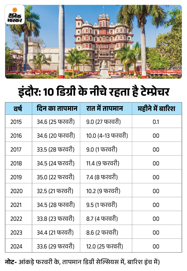 इंदौर में बारिश का ट्रेंड नहीं फरवरी के महीने में इंदौर में बारिश होने का ट्रेंड नहीं है। 2015 में बूंदाबांदी जरूर हुई थी। दूसरी ओर, दिन में अधिकतम तापमान 32 डिग्री के पार ही रहता है। 2019 में तापमान 35 डिग्री दर्ज किया गया था। यहां रात में पारा 10 डिग्री के नीचे रहता है। हालांकि, पिछले साल यह 12 डिग्री रहा था। यहां 1 फरवरी 1929 को रात का पारा रिकॉर्ड 2.8 डिग्री पहुंच चुका है। दिन में 37.9 डिग्री रहा था, जो 22 फरवरी 2006 को दर्ज हुआ था। इंदौर में साल 2001 में पूरे महीने करीब दो इंच बारिश भी हो चुकी है।